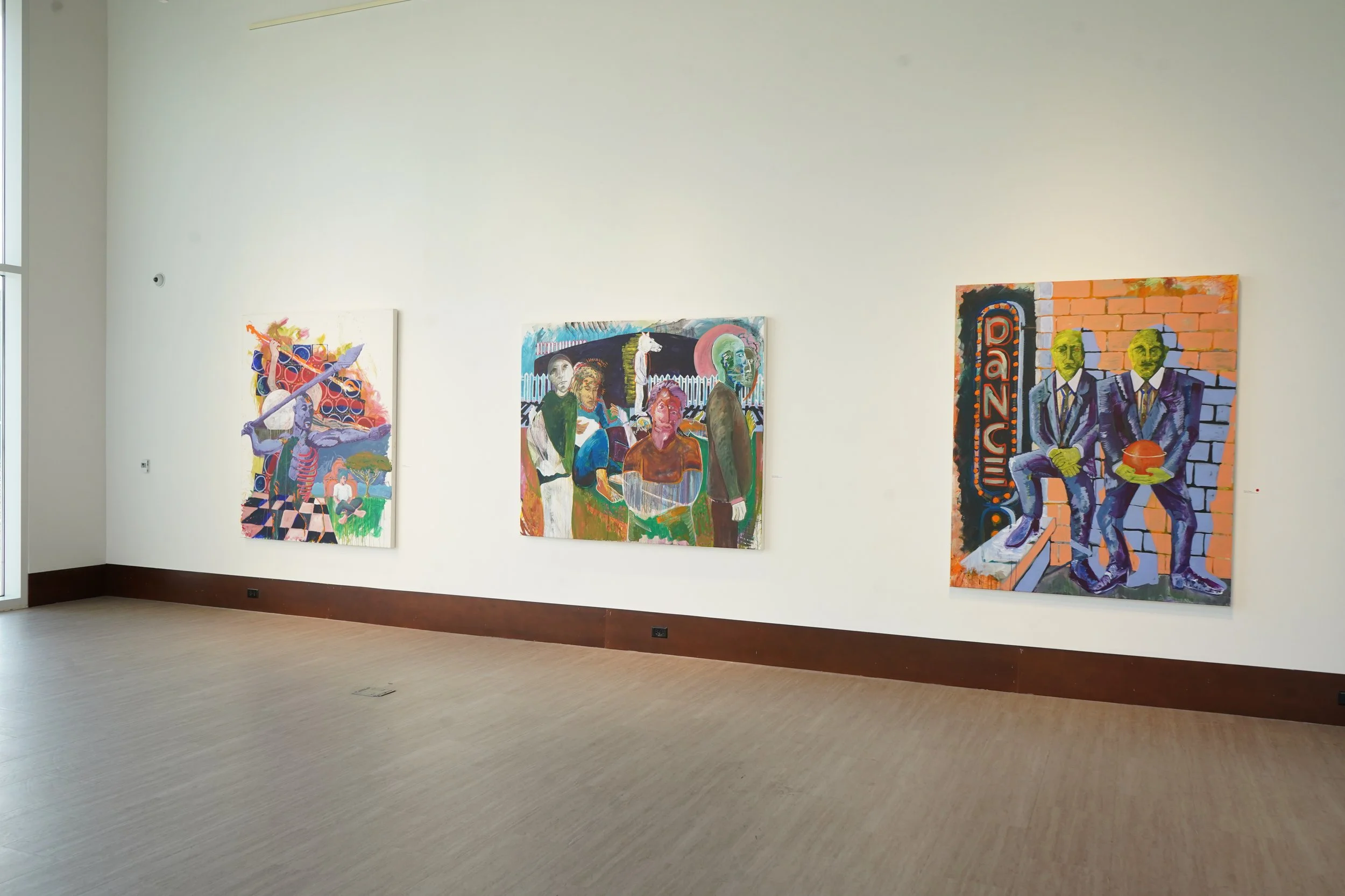 I, along with my peers, have been thrust into the age of technology, forcing our eyes down to our phones – worrying about our online presence rather than creating genuine connections with the people immediate to us. The mental health of young men, including the anxiety than comes with social media, is of great interest to me as I slowly try to care less about what people think of who and what I am. Concerned with the status of human-interaction, I am interested in understanding our unfixed subjectivity as it constantly shifts and molds to the environment like a self-sufficient organism. My paintings focus on the distorting or caricaturing of the human form as a psychological figuring, a limbo between the real and surreal. My work encompasses common motifs of masks and white fences referring to the different barriers we put up in different social situations to feel secure within ourselves. The connections we make in today’s world are built on how many followers we have, eliminating the intrinsic value of each of us. The danger that I am trying to keep at bay is the unknown. I cannot imagine what subconscious barrier I will put in place to compensate for it.